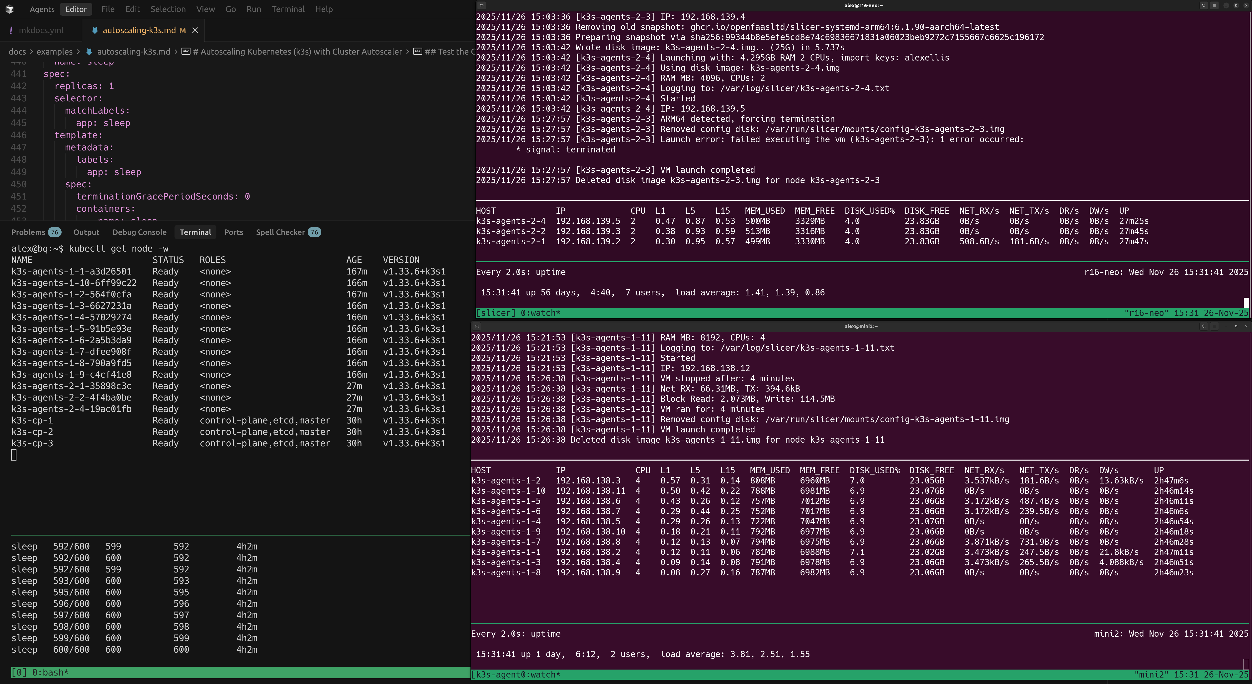 Example showing 600 Pods running across two Slicer hosts running worker nodes - a Ryzen 9 and a Raspberry Pi 5. The Control Plane is running on a separate N100 fanless mini PC.